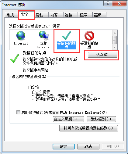 打开IE浏览器,选择工具→Internet选项,在弹出的对话框中选择“安全”标签,选择【可信站点】后点击【站点】按钮,如下图所示。