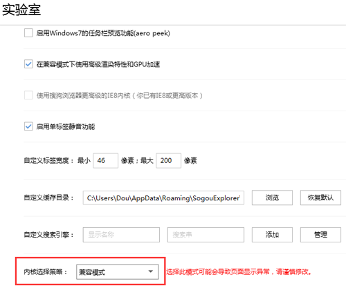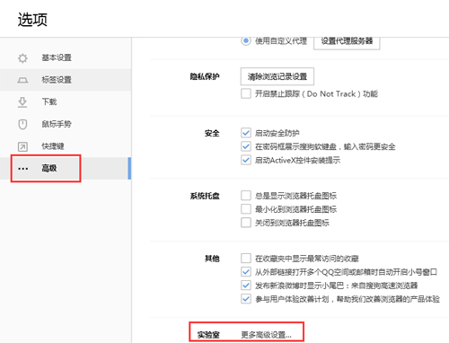 打开搜狗浏览器,点击工具->选项,在弹出的对话框中选择高级,点击实验室-更多高级设置,在内核选择策略中选择“兼容模式”。如图3-1,3-2所示。
