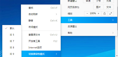 打开QQ浏览器,点击菜单->工具->切换兼容性模式->默认,如图4-1所示。