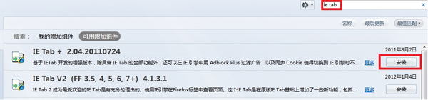 步骤一、打开firefox浏览器,点击“工具”->“附加组件”,在管理器中的搜索框里输入ie tab,安装ie