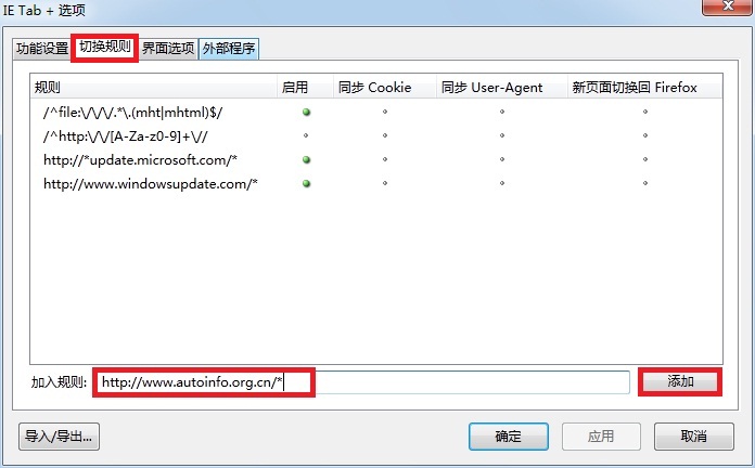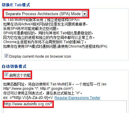 6-2,在自动切换模式里选择启用这个功能,并输入http://www.chinayanwen.com/*,然后点击保存按钮。