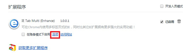 步骤二、点击chrome浏览器“工具”->“扩展程序”,弹出如图 2-8页面,点击【选项】链接,在弹出框里切换