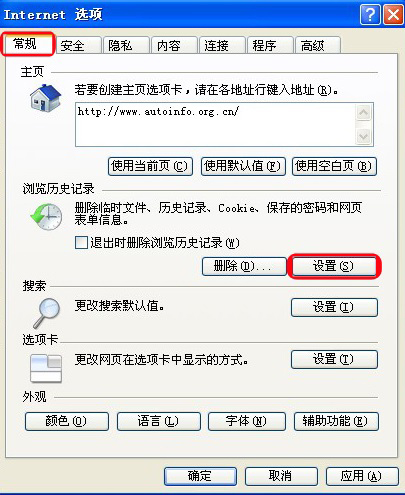 打开IE浏览器,选择工具→Internet选项,在弹出的对话框中选择“常规”标签,在【浏览历史记录】后点击【设置】按钮,如下图所示。