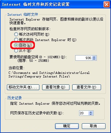 在弹出的【Internet临时文件】选项中,选择【自动】选项,按【确认】按钮,如下图所示。