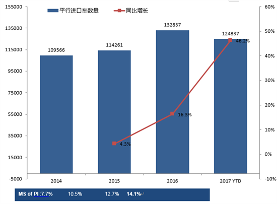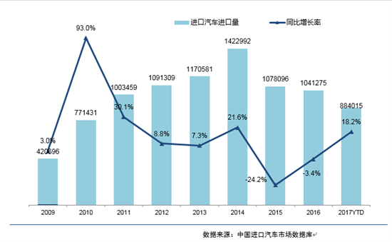 2017年进口车终端销售弱势复苏,新能源汽车进口量增大,平行进口车市场规模进一步扩大
