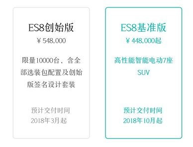 根据蔚来APP上的信息来看,由于每一辆ES8都为定制款,限量10000台的ES8创始版将于2018年3月起进行交付,而ES8基准版将于2018年10月起进行交付。