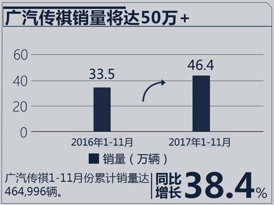 今年1-11月,广汽传祺累计销量超46万辆,同比大涨38.9%,其中传祺GS4自上市以来累计销量已突破76万辆;传祺GS8 10月、11月销量连续破万;8月上市的传祺GS7/GS3累计订单量分别超1.5万辆、3万辆,其中GS3月销已突破5,000辆。轿车方面,传祺GA6持续保持中国品牌细分市场前列,传祺GA8更已连续多月位居中国品牌C级豪华轿车销量第一。