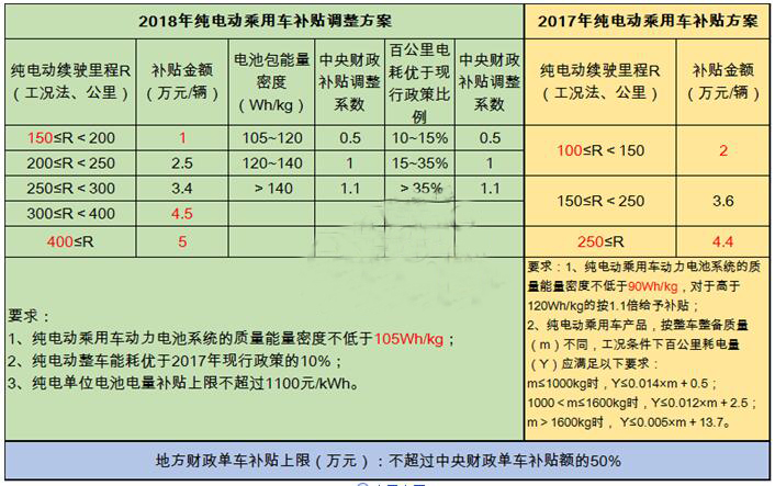 2018年纯电动乘用车补贴调整方案对比