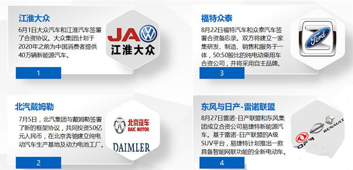 随着江淮大众合资公司的诞生,一股新能源合资浪潮随之而来。7月5日,在中国国家主席习近平与德国总理默克尔的共同见证下,北汽集团与戴姆勒签署了新的框架协议,双方表示,将共同投资50亿元人民币,引入梅赛德斯-奔驰品牌的纯电动汽车产品,在北京奔驰建立纯电动汽车生产基地及动力电池工厂。福特汽车于8月22日宣布,与众泰汽车签署了合作备忘录,双方将为中国消费者提供采用自主品牌的纯电动汽车,合资双方将各持50%股份。8月27日,东风汽车集团股份有限公司与雷诺日产联盟宣布将建立一家新的合资企业——易捷特新能源汽车有限公司,以联合开发电动汽车并在全球销售。而后,媒体曝出宝马长城合资的传闻,虽然最终长城汽车与宝马两家公司对外界的回应都比较隐晦,但是最近长城汽车新基地落子重庆永川的消息又让业界对宝马长城的合资事宜浮想联翩。