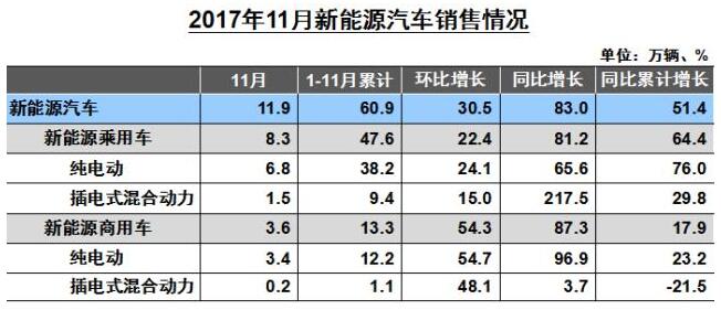 进入2017年,受新能源汽车推广目录重审的影响,新能源汽车销量出现断崖式下跌,不过随着补贴政策重新规范调整以及市场需求逐步回归正常,今年新能源汽车产销呈现顽强走强的特征。中汽协数据显示,2017年11月,新能源汽车销量11.9万辆,同比增长83%,月度产销量创历史新高,并且实现10个月的月度连续环比增量;1-11月,新能源汽车销量60.9万辆,同比增长51.4%。