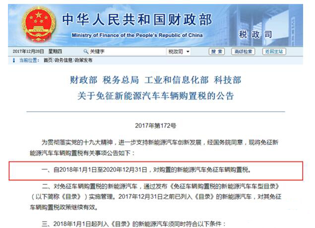政策:2017年12月27日,财政部、税务总局、工业和信息化部以及科技部联合发布关于免征新能源汽车车辆购置税的公告,公告称,自2018年1月1日至2020年12月31日,对购置的新能源汽车免征车辆购置税。对免征车辆购置税的新能源汽车,通过发布《免征车辆购置税的新能源汽车车型目录》实施管理。2017年12月31日之前已列入《目录》的新能源汽车,对其免征车辆购置税政策继续有效
