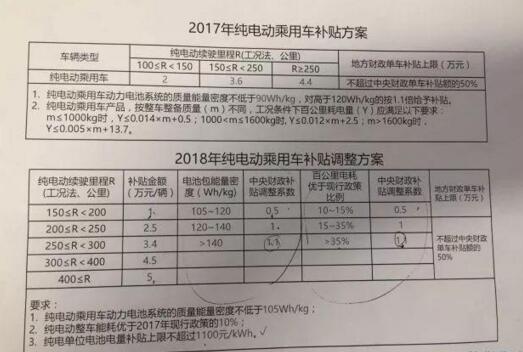 从最新曝光的补贴方案手稿来看,2018年纯电动乘用车补贴方案将续航里程的划分档次增加至5档,分别为“150公里-200公里”、“200公里-250公里”、“250公里-300公里”、“300公里-400公里”、“400公里以上”,续航里程的门槛由原先的100公里提升至150公里。此外,动力电池的最低密度要求也提升到105Wh/kg。