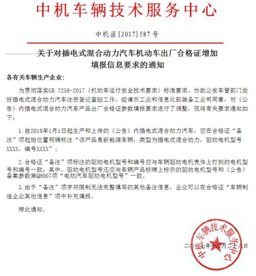 近日,中机车辆技术服务中心发布《关于对插电式混合动力汽车机动车出厂合格证增加填报信息要求的通知》,要求对《公告》内插电式混合动力汽车产品出厂合格证参数填报要求进行了调整。