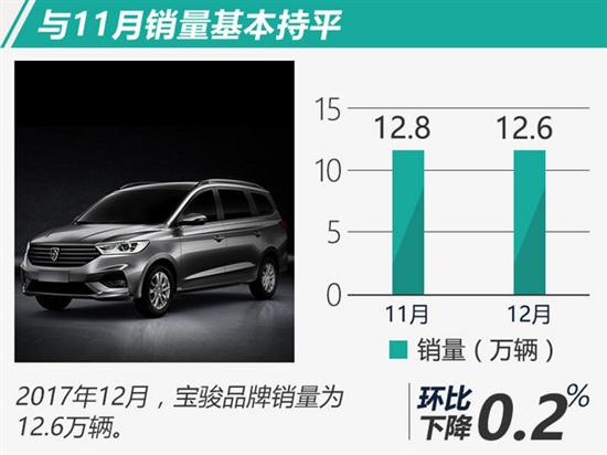 去年12月,宝骏单月销量达12.6万辆,相比11月份128,486辆成绩,环比下降0.2%。在2018年,宝骏品牌还将继续发力推出多款新车,扩充产品阵营,持续保持销量增长。