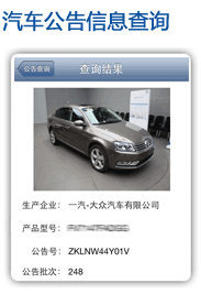 汽车公告信息查询服务为您提供及时的最新公告批次信息发布提醒;随时随地查询车型公告号,方便、实用 | ![]() |