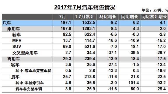 | 运动型多用途乘用车(SUV) | 698326 | 5368286 | 17.85 | 689512 | 4526684 | 16.99 |
