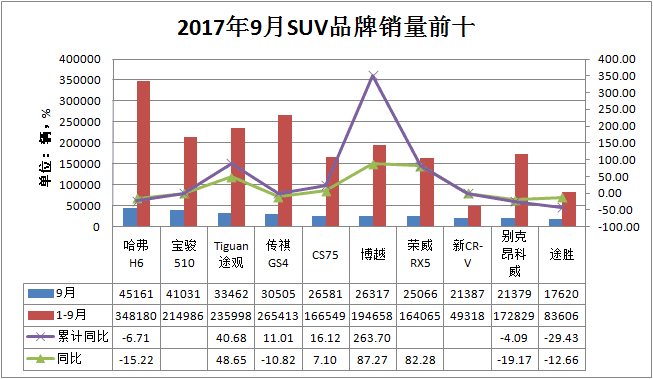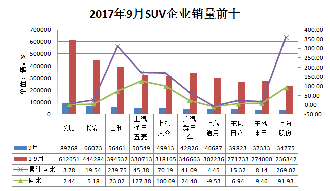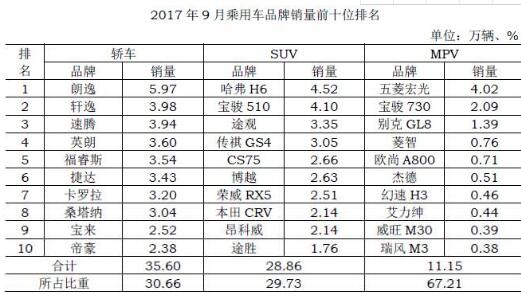 | 运动型多用途乘用车(SUV) | 964791 | 7073585 | 16.39 | 970809 | 6961887 | 16.05 |